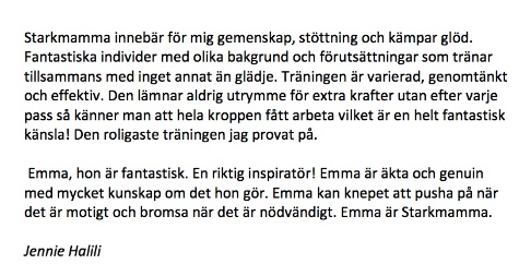 StarkMamma startades augusti 2013 av mig, Emma, här i Varberg. Då hade jag just fött vårt andra barn och saknade möjligheten till anpassad träning där jag oxå kunde ha med mig min son. Jag tänkte att det jag saknar borde väl många andra oxå sakna!