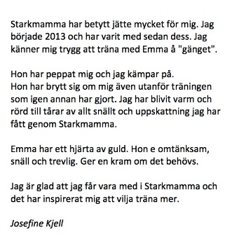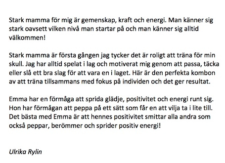 StarkMamma ska erbjuda effektiv, varierande och rolig träning! Gemenskapen finns i fokus, på olika sätt peppar och pushar vi varandra! Träning ger energi, och att känna hur mycket kroppen klarar av ger en så stark och positiv känsla!